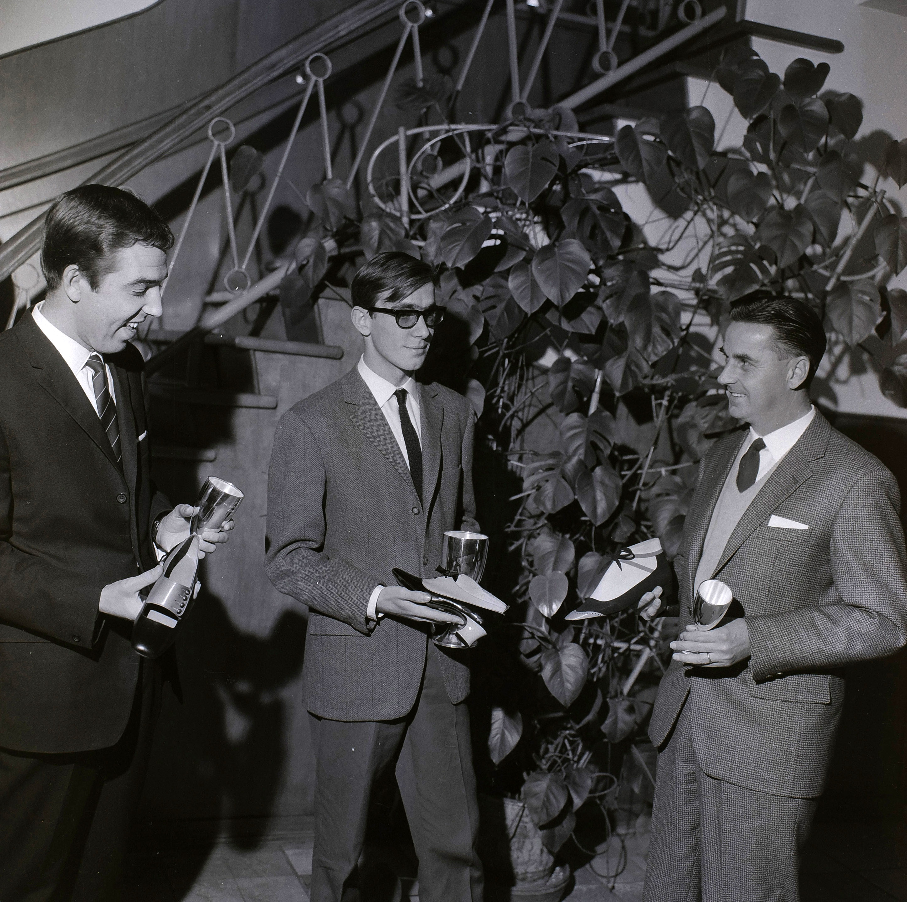 De uitreiking van de prijzen voor de standhouders van de Micro-show in het Café-Restaurant (te herkennen aan de balustrade) in 1966.
