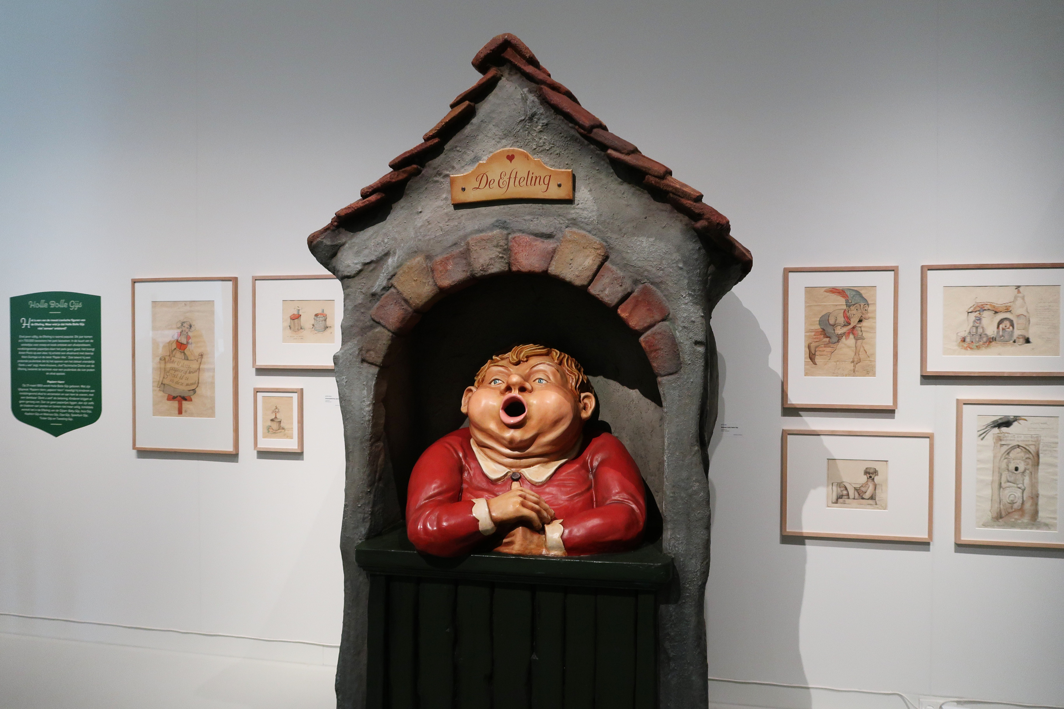 Mobiele Gijs omringd door ontwerptekeningen zoals te zien op Efteling: De Tentoonstelling.
