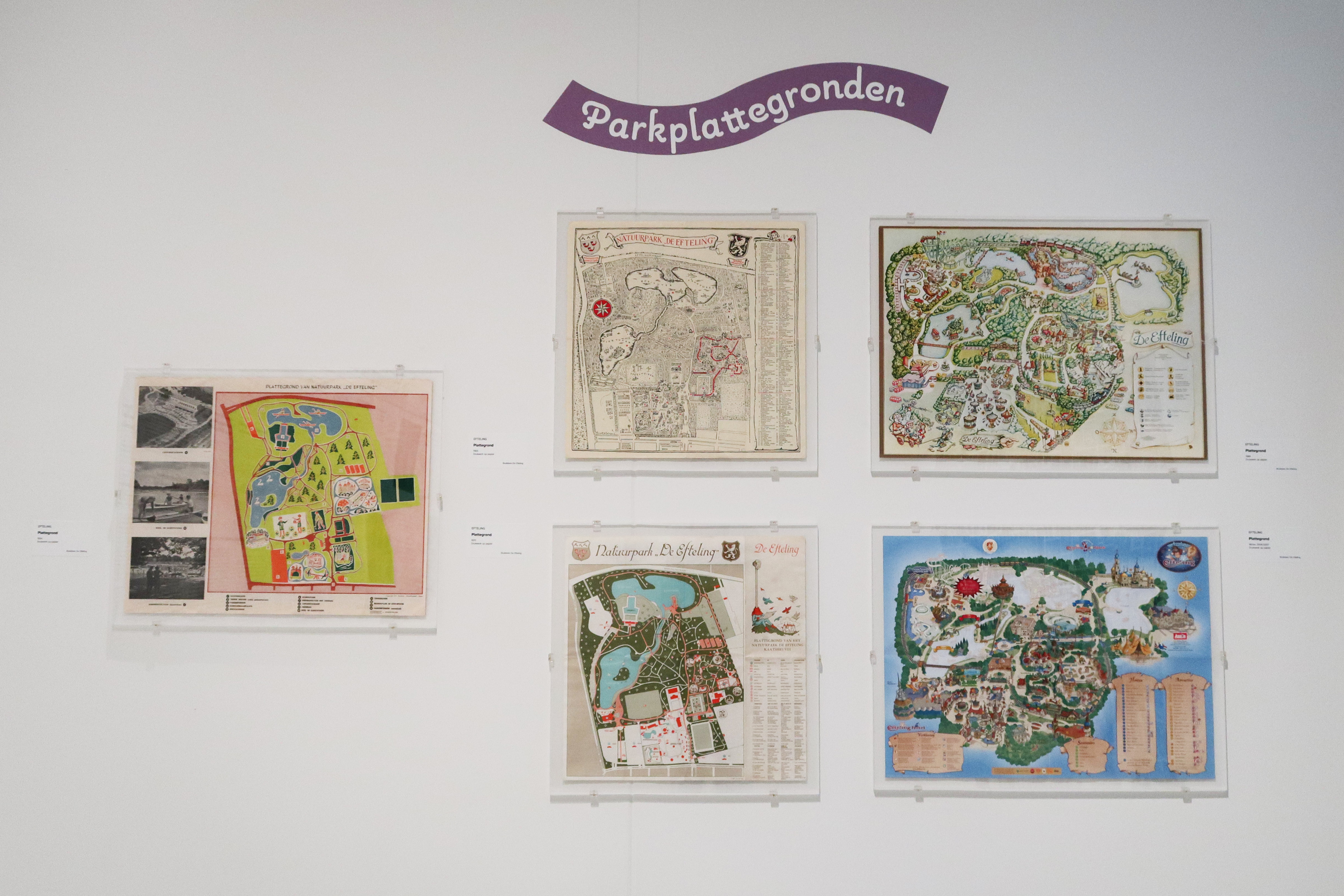 Diverse plattegronden van de Efteling, zoals te zien op Efteling: De Tentoonstelling.