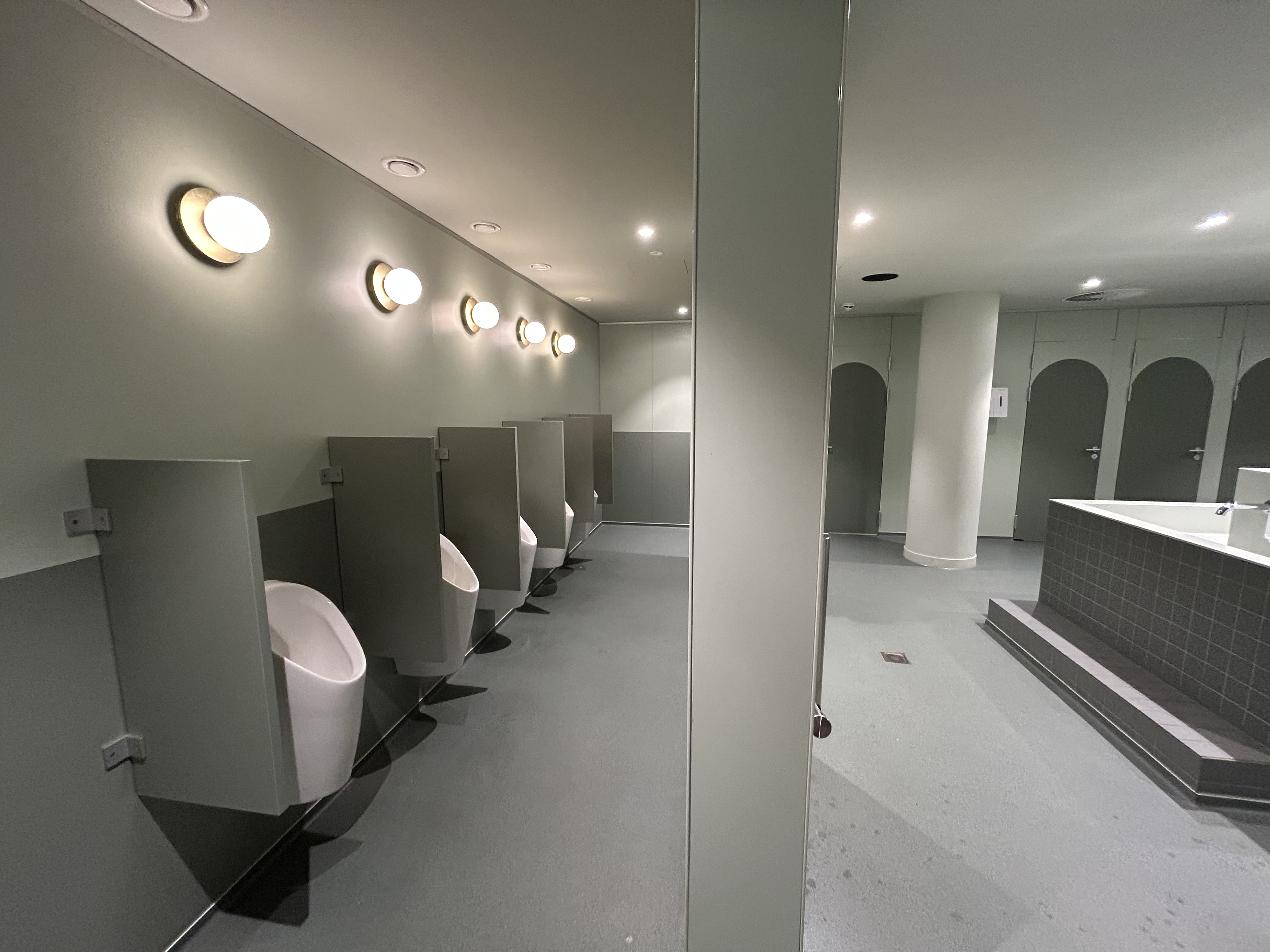 Achter een muurtje achterin de Toiletten Grand Hotel bevindt zich een trits urinoirs.