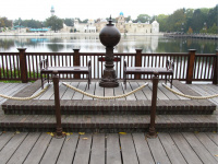 Op de vijver zijn vier bronzen beelden van kikkers opgesteld, met elk boven diens hoofd een oversized lantaarn.