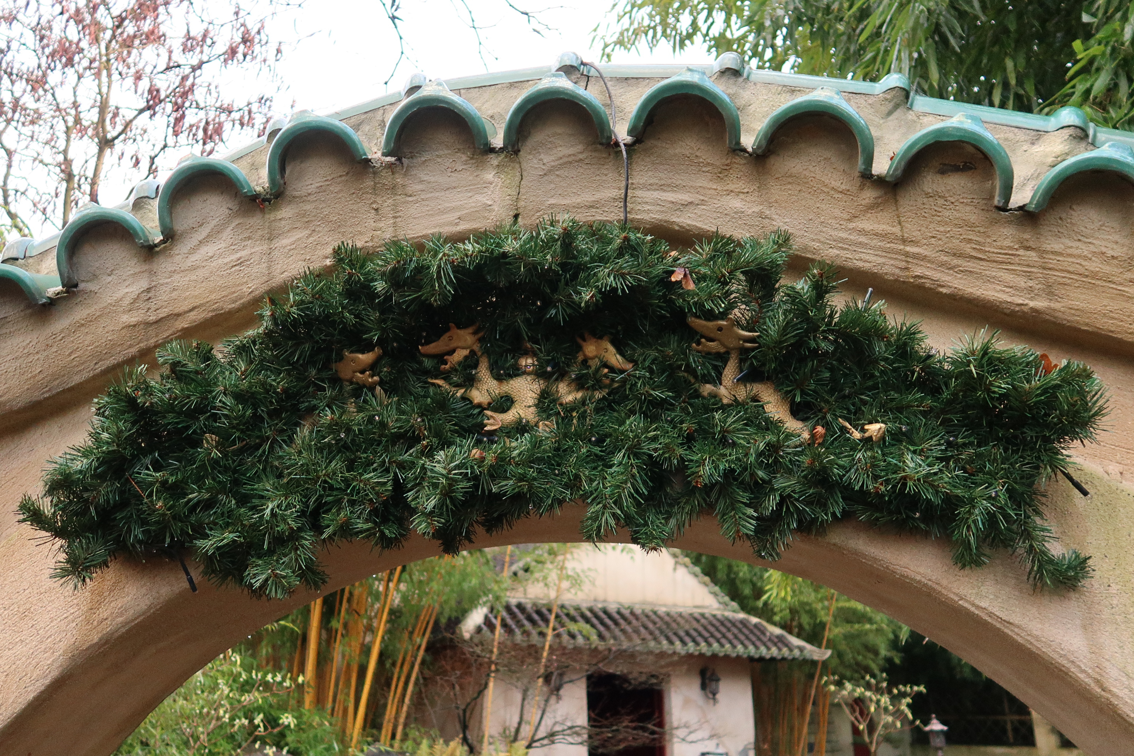 Toegangspoort Chinese Nachtegaal met guirlande en gouden drakenornamenten tijdens de Winter Efteling.