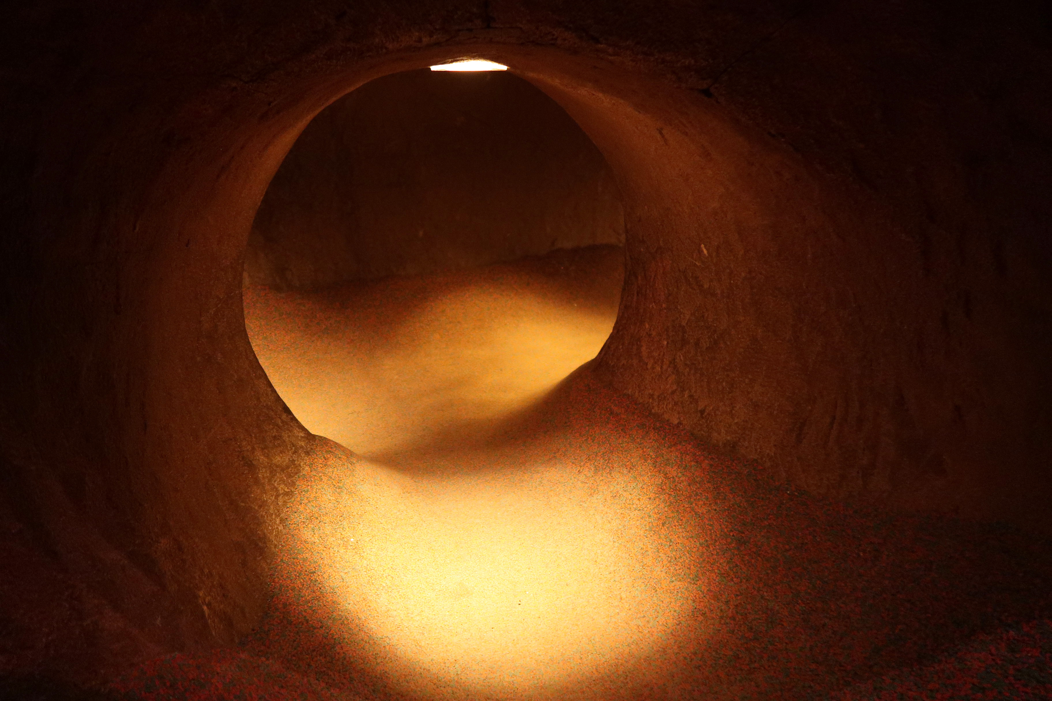 Tunnels in de rots in de savanne van de Speelwereld van Fabula.