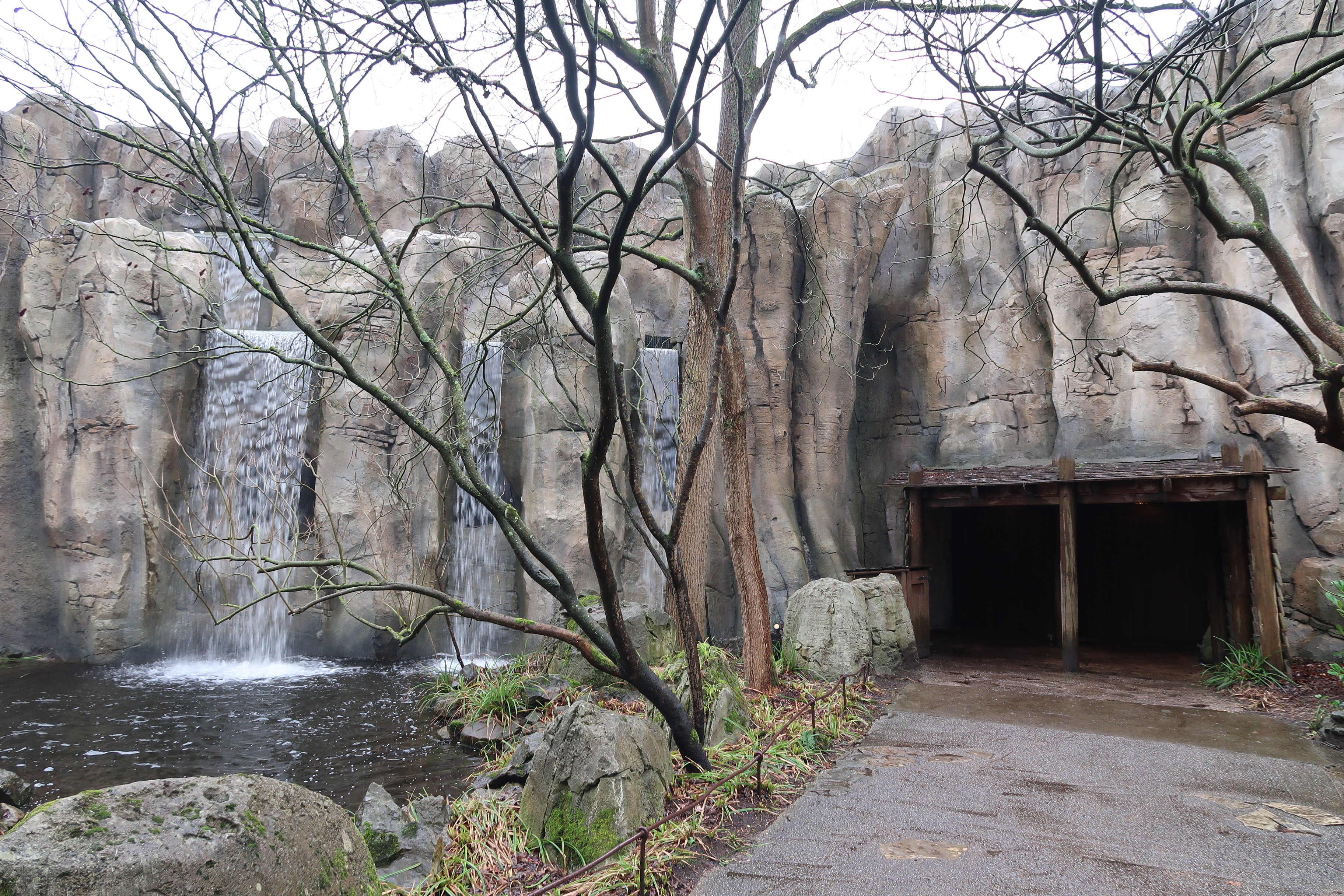 De uitgang van PandaDroom / Fabula tijdens de winter, onderdeel van het Wandelwoud. Links het vijvertje met watervallen waaronder zich de grot, het laatste stuk van de wachtrij, zich bevindt.