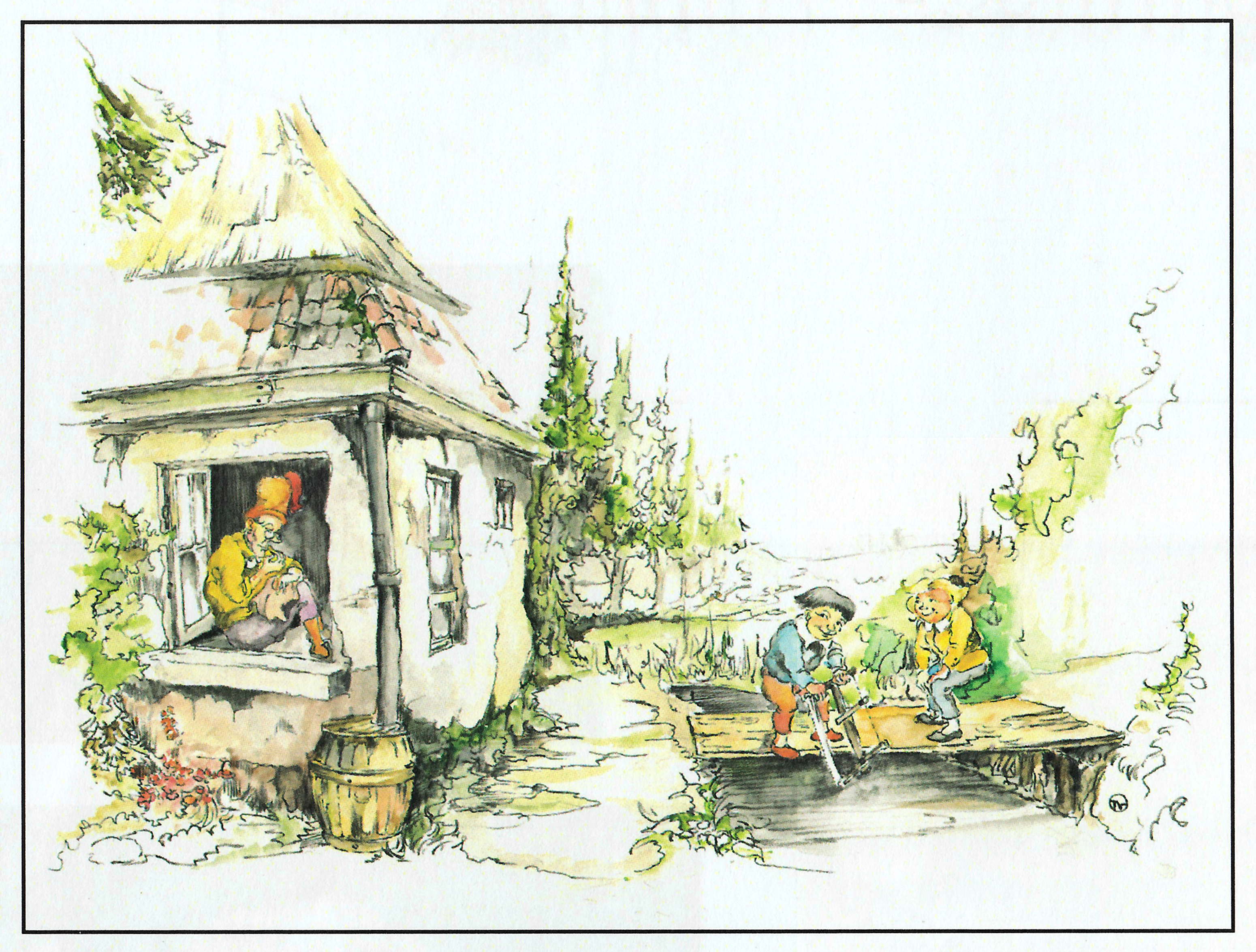Ontwerp Ton van de Ven, destijds in dienst bij Heimo (1967-1970), voor scène uit de verhalen van Max en Moritz (personages). Hun derde streek: het doorzagen van het bruggetje voor het huis van kleermaker Böck.