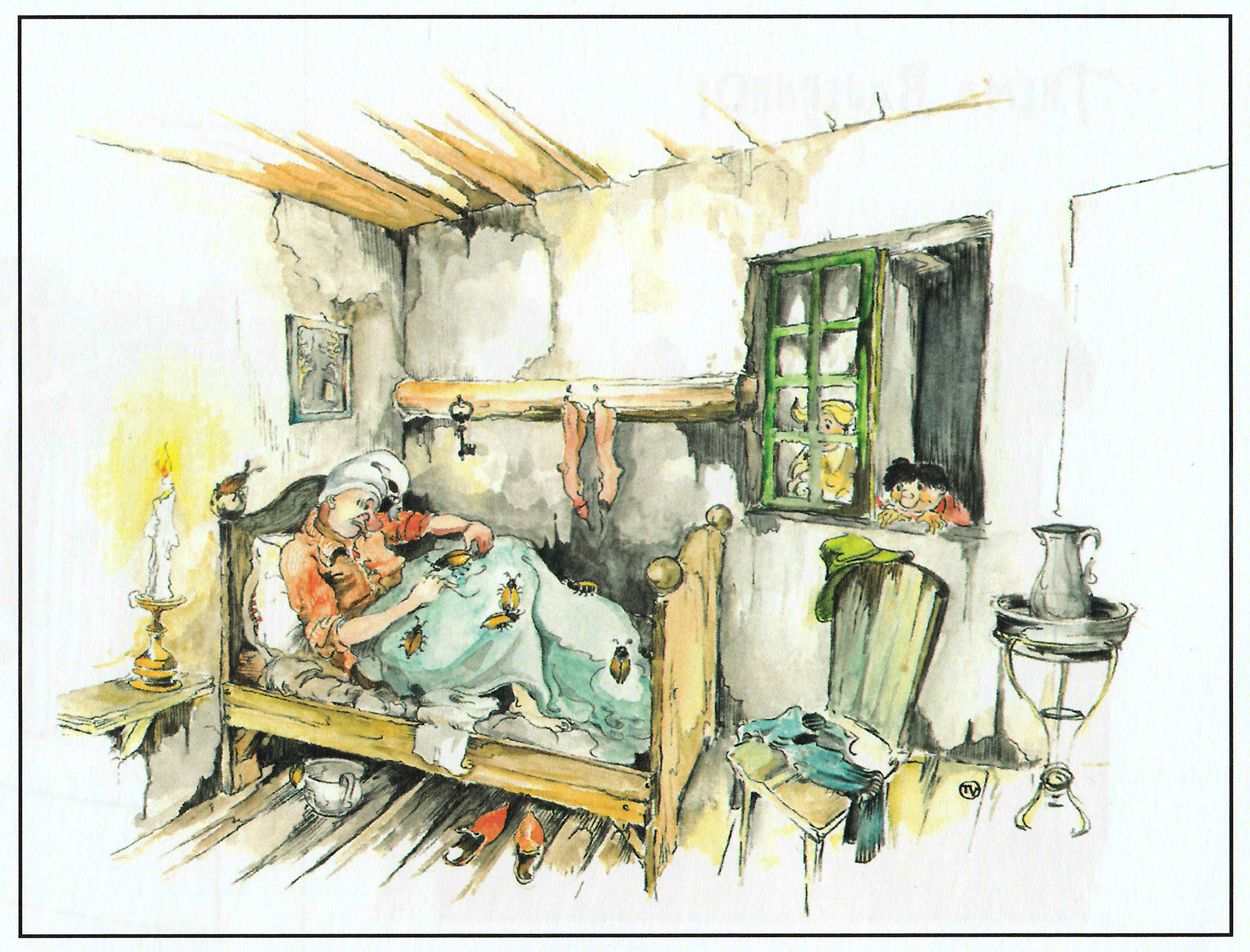 Ontwerp Ton van de Ven, destijds in dienst bij Heimo (1967-1970), voor scène uit de verhalen van Max en Moritz (personages). Hun vijfde streek: meikevers in het bed van Oom Fritz.