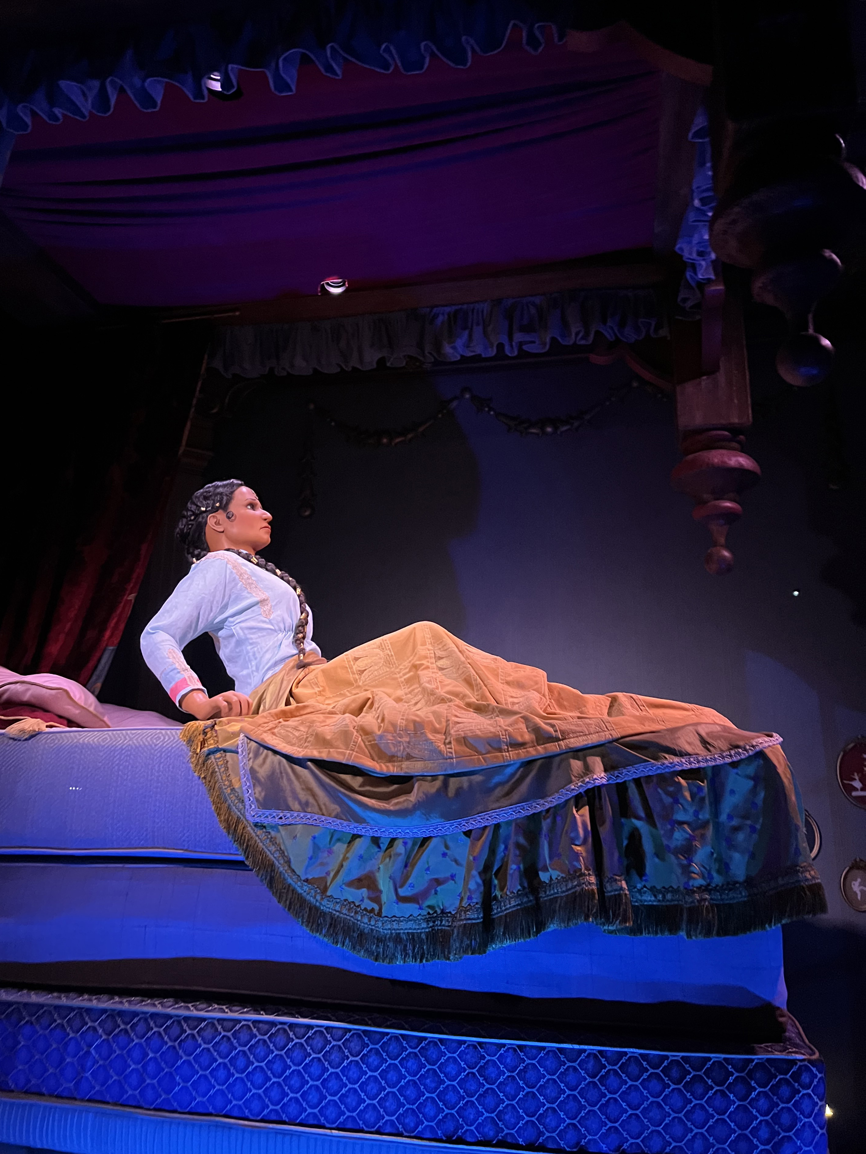Prinses Adinda op haar matrassen in het sprookje De Prinses op de Erwt, avondshot - november 2025 - Foto: Eftepedia