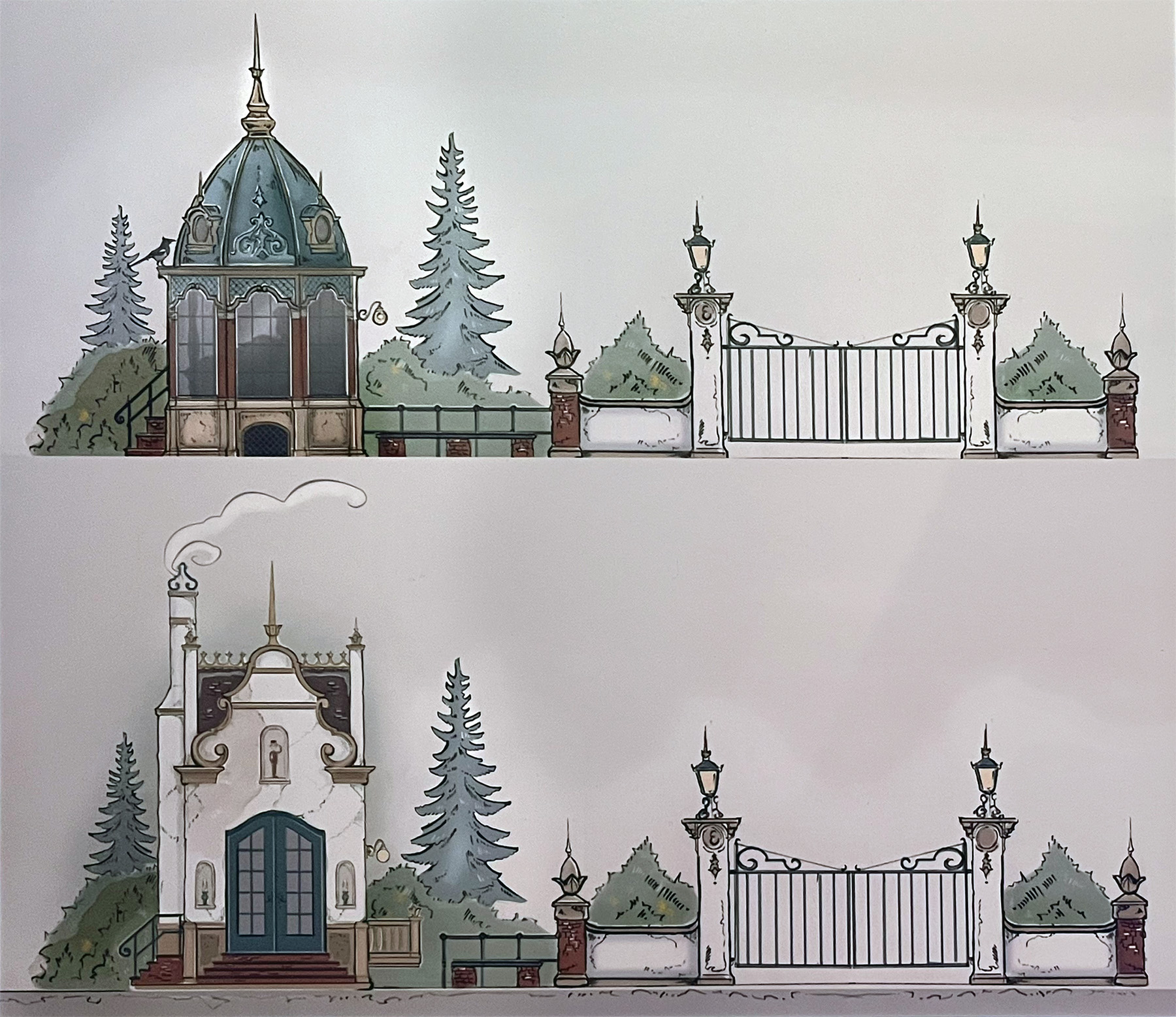 Ontwerp voor De Prinses op de Erwt in de vorm van een theekoepeltje (boven) en dichter bij de uiteindelijke versie, met klokgevels (onder)