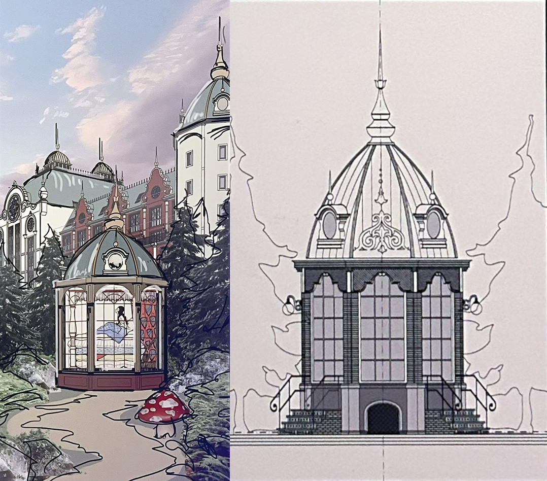 Vroege schets De Prinses op de Erwt als theekoepeltje en uitgewerkte versie.