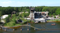 De omloop rechts om de hoek volgend komen we langs nog meer ramen en deuren. Sommige panden hebben een uithangbord: 'Het Gulden Galjoen', 'De Zandlooper'. Helemaal achteraan komen we bij een hoge toren met een schuine, slurfachtige houtconstructie ertegenaan. Onder deze constructie door hebben we uitzicht op een duinlandschap waar het buitengedeelte van de achtbaan doorheen raast.