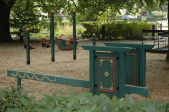 Ook zijn er nieuwe objecten geplaatst die wel in traditionele Pieckkleuren zijn geschilderd en van ornamenten zijn voorzien. Dit zijn een speelhuisje met een glijbaan, vier schommels, een klein klimrek met een vreemd uitgesneden Piecktekening erop, een evenwichtsbalk, drie bokkensprongpaaltjes en vier verende stapstenen die te ver uit elkaar geplaatst zijn.