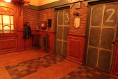 De bezoekers nemen een trap en komen in het Loonlokaal, een met hout betimmerde ruimte waarin ze voor zich drie genummerde gesloten loketten treffen met daarboven de aanduiding loonadministratie, waarachter het geluid van typemachines klinkt, en een verdieping hoger een balkonnetje waar Gustave Hooghmoed in hoogst eigen persoon staat.
