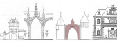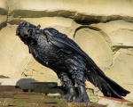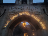 Boven de poort staat groot de naam van de stad, Raveleijn, eromheen een reliëf met raven, en erboven een beeldje in een nis van een ridder op een steigerend paard. Midden in de poort hangt een lantaarn die heen en weer zwiept. Ook zijn er nog effecten als flarden muziek, borrelend en opspattend water naast de poort en mistvorming rondom het water en aan de achterzijde. Sporadisch licht rondom de poort een tekst op, "Waar raven ruyters zullen zeyn": een effect op basis van lichtpuntjes uit glasvezels. Bij iets meer dan minimale beschouwing blijkt dat de tekst geen hout snijdt: de raven worden in het verhaal immers niet de ruiters, maar de paarden.