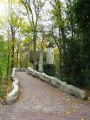 Het pad omhoog heeft andere bestrating dan het klinkerpad van het Sprookjesbos. De muren lijken uit rotsblokken te bestaan. Links van het pad ligt een vennetje. Eenmaal boven komen we aan onze linkerhand bij het kleine, karakteristieke huisje van grootmoeder. Het moment uit het sprookje dat hier wordt uitgebeeld is de wolf die in oma's bed ligt en Roodkapje die op het punt staat binnen te komen.