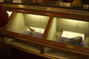 In het fraaie sprookjeskabinet, dat in het midden van de ruimte van het museum stond, waren zes voorwerpen uit sprookjes te vinden, elk op een paars fluwelen kussentje:
