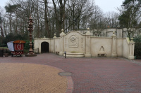 De gehele zuidkant van het plein is afgeschermd van de ingang van Fabula, het voormalige Spookslotplein, met een afgebrokkelde maar gestucte muur met scheuren. De muur bestaat uit negen pilaren waartussen wanden zijn opgetrokken met ongelijkmatige afwerking aan de bovenkant. In het midden is een groot verroest hek te vinden met gebogen tralies en een enorm hangslot. Aan de linker- en rechterkant van deze poort is een ronde opening in de muur gemaakt, voorzien van tralies. Aan de beide uiteindes van de complete muur zijn puntvormige wanden geplaatst met een ringvormige hap er uit.