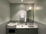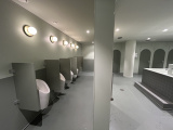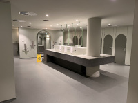 De toiletten zijn niet opgedeeld naar specifieke genders maar bevinden zich rondom een groot wastafelmeubel jn het midden van de ruimte. In de wanden aan weerszijden zitten afgeronde deuren (die doen in die zin wat denken aan Kleine Boodschap) waarachter elk zich een zittoilet bevindt. Achter een muurtje aan de achterzijde van de ruimte hangt een hele rij urinoirs. In de hoek zijn ook nog familietoiletten waar een ouder en kind samen een hogere en lagere wcpot kunnen gebruiken.
