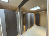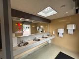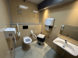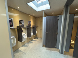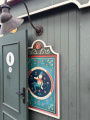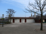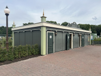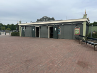 Het gebouw is aangekleed met kleine lampjes naast de deuren; daarnaast hangen aan de meest rechter deel enkele stallampen met daaronder posters: een design met Kleine Boodschap en een plattegrondje van alle toiletten in het park.